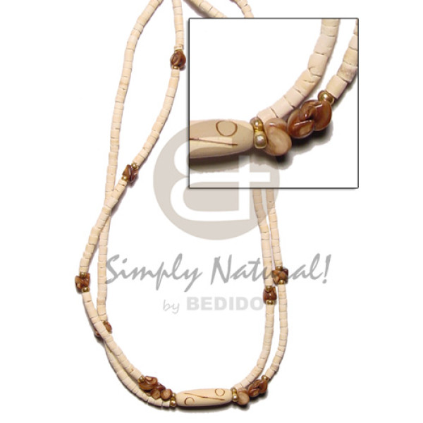 5 rows 2-3mm nat. heishe layered white mongo shells, coco tusks & chips, nat. wood saucer,coco side..