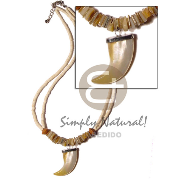 2 rows coco heishe bleached sq. cut gold lip & wood bead MOP fang pendant..