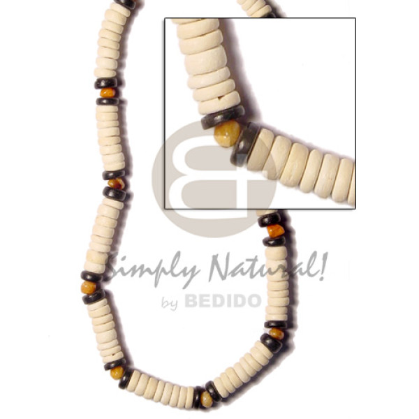 2-3mm coco heishe nat. brown/bleach, palmwood bamboo burning & sq. cut hammershell accent..