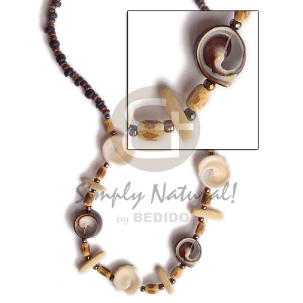 4-5mm nat brown coco Pokalet oval amber horn beads accent 60mm round blacklip pendant in 2 rows 4-..