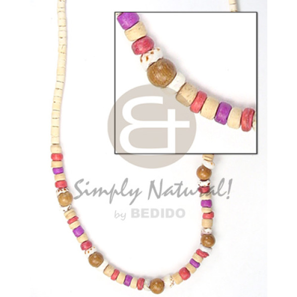 2-3mm coco heishe bleach 4-5mm coco Pokalet combination violet/red/nat tiger puka & wood beads alt..