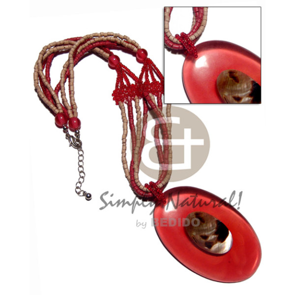 45mm round nat. kabibe shell pendant on 2 layers 2-3mm coco heishe/2layers wax cord/2layers cut glas..