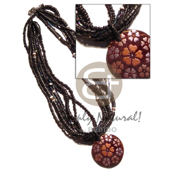 7 rows 2-3mm coco heishe golden tan 40mm handpainted hammershell round pendant..