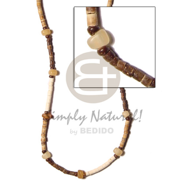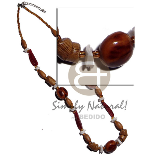 4-5mm brown coco Pokalet. brown kukui nuts, coco sticks, buri tiger seed, asstd. wood beads and dan..
