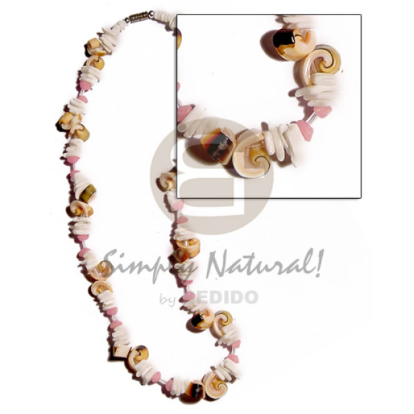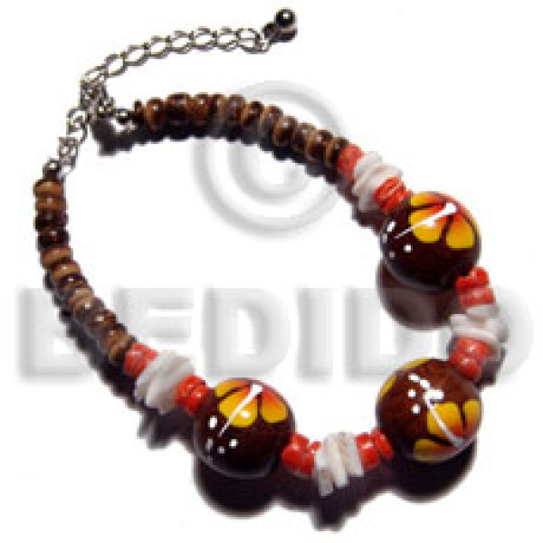 4-5mm coco Pokalet. nat. brown handpainted 15mm robles round wood beads & white rose shell accent /..
