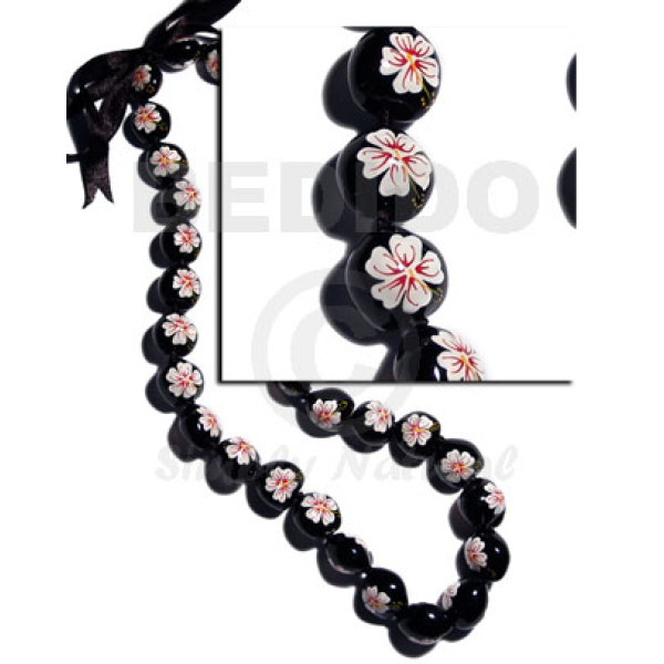 lei / black kukui seeds handpainted white and red flowers - 32 pcs/ 34 in.adjustable..
