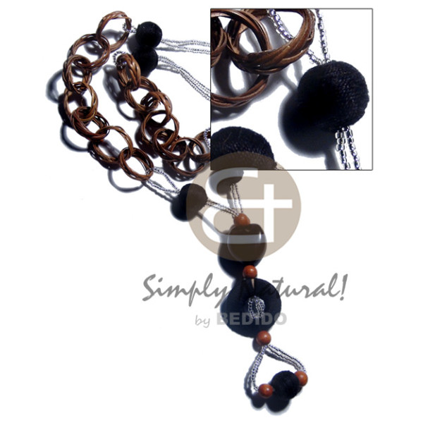 tassled 2 layers satin cord glass and wood beads, 7-8mm coco Pokalet, 2-3mm coco heishe, oval 25mmx..