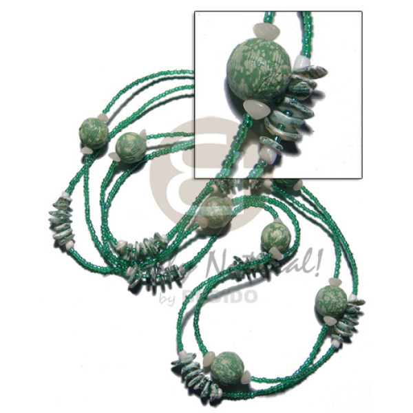 single layer textured painted wood beads matching splashing white rose shells and glass beads / gre..