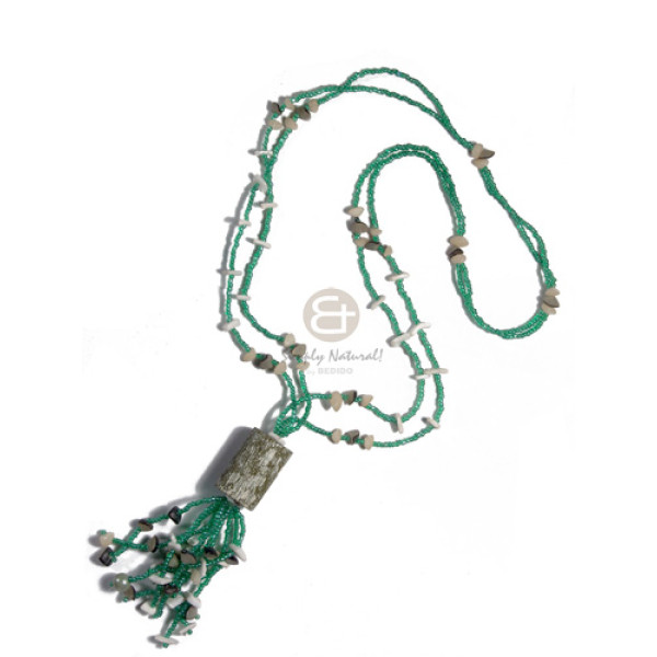 2 layers green glass beads white rose, buri nuggets combination and tassled 30mmx20mm cylinder text..