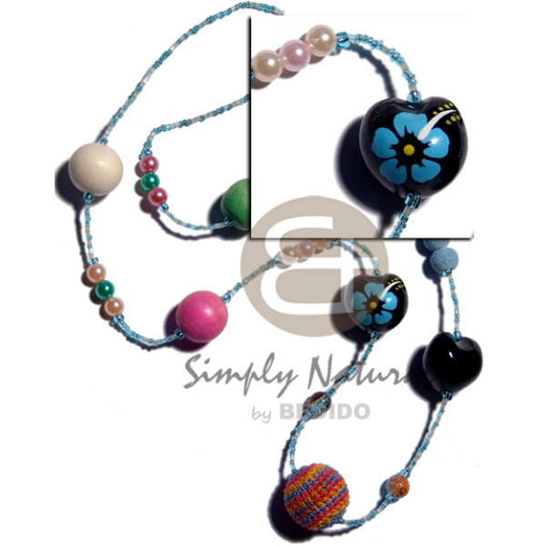 tassled 2 layers satin cord glass and wood beads, 7-8mm coco Pokalet, 2-3mm coco heishe, oval 25mmx..