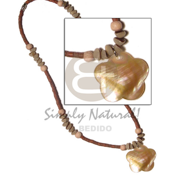 2-3 coco heishe dark tan rosewood beads, buri nuggets and 35mm scallop brownlip pendant..