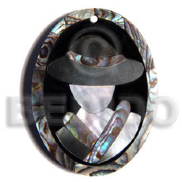 50mmx38mm oval pendant /elegant hat lady delicately etched in shells - brownlip, blacklip and paua ..