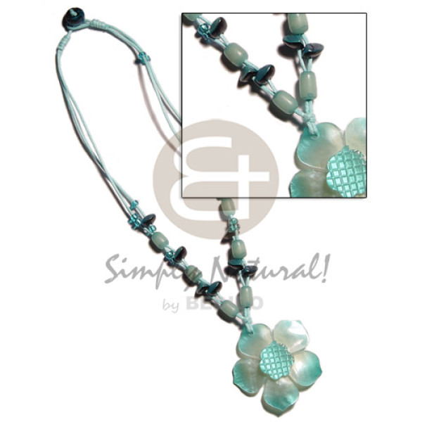 2 layer knotted aqua blue wax cord buri & shells accent and graduated aqua blue hammershell flower..