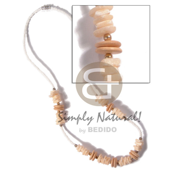 3 rows raffia in graduated length 21 pcs. round 18mm pink hammershell and glass beads accent..