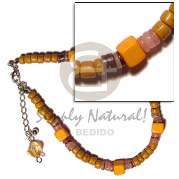 mustard 4-5mm coco Pokalet. /hammershell heishe alt. yellow wood cube combination..