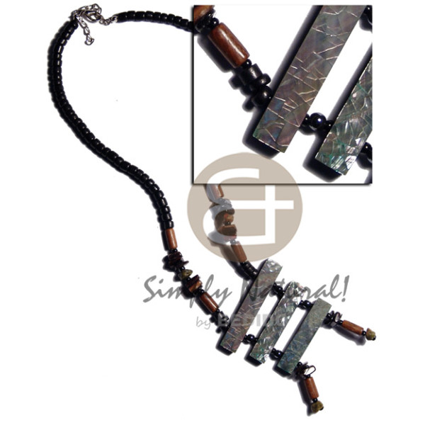 3 layers glass beads wood beads and sq. cut 55mm blacktab shell accent and round blacktab pendant..