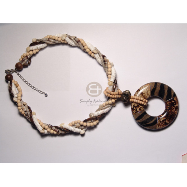 nat. wood ring dangling round hammershell, asstd.shells,bamboo & wood beads looping tassle on wax c..