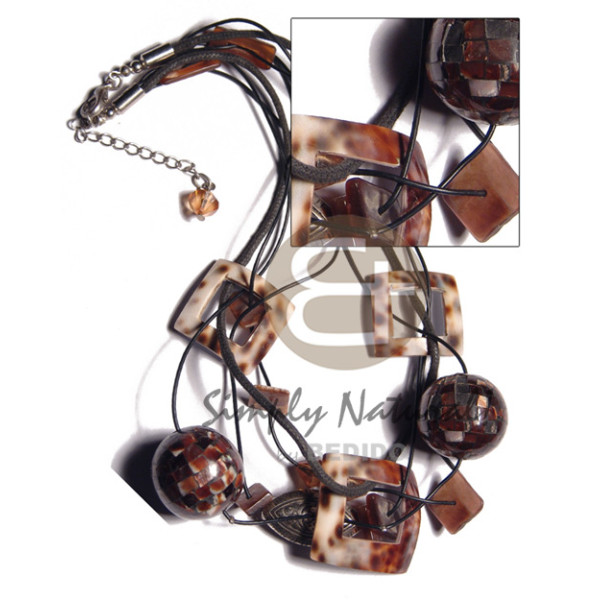 5 layers wax cord bayong wood beads and 65mmx45mm laminated in resin capiz circles in oval pendant..