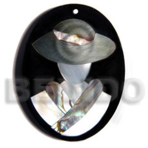 50mmx38mm oval pendant /elegant hat lady delicately etched in shells - brownlip, blacklip and paua ..