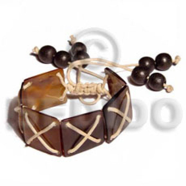 7 pcs. 20mmx20mm brownlip squares in black criss cross wax cord wood beads..