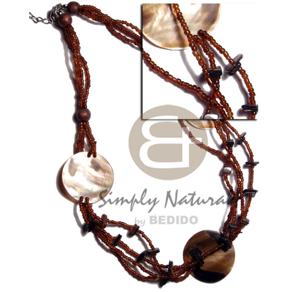 3 pcs. 30mm round tiger brownlip shells in 4 layers glass beads blacktab chips accent..