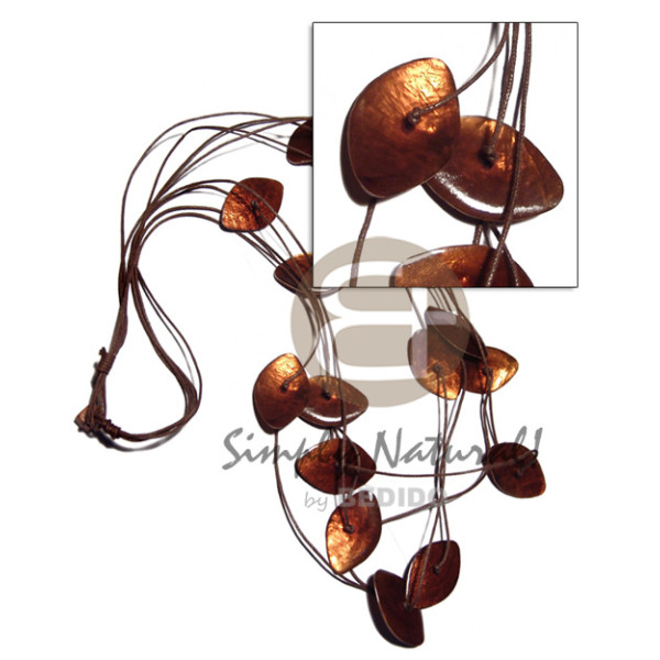4 r0ws dark brown wax cord 16 pcs. 40mmx25mm laminated eyelet capiz in dark amber tones / 34in..