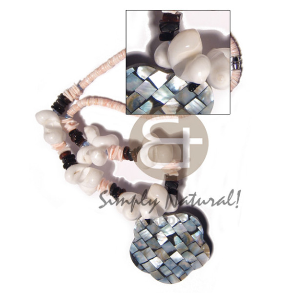 orange 2-3mm coco heishe wire choker buri & troca beads accent 40mm flower MOP skin nectar penda..