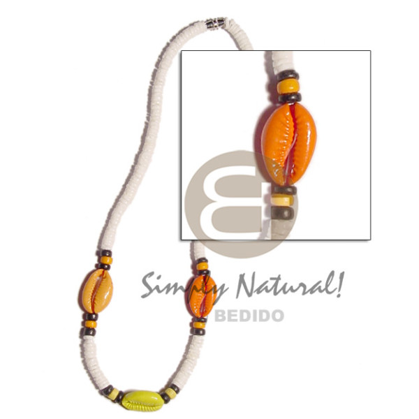 orange intertwined glass beads dangling 12mm round MOP shell chips in resin pendant / 18in..