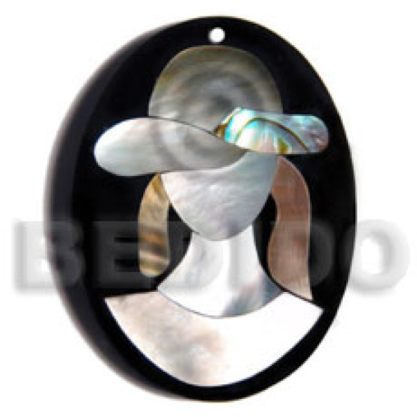 50mmx38mm oval pendant /elegant hat lady delicately etched in shells - brownlip, blacklip and paua ..