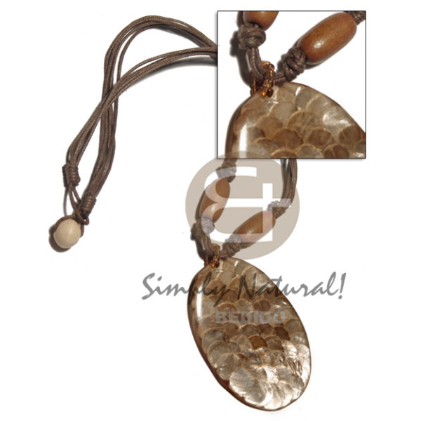 50mmx18mm triangular laminated cracking blacklip pendant backing on 3 rows leather thong..