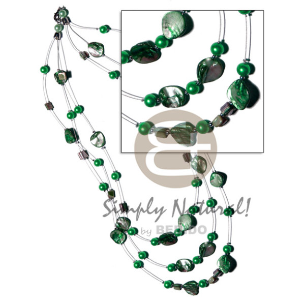floating green kabibe shell nuggets in 3 graduated rows of magic wire 28" / 24" / 22" pearl beads..