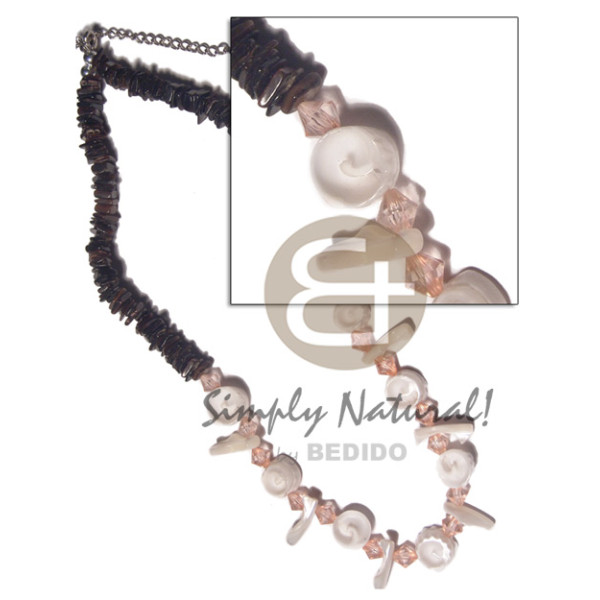 wood tube white clam, cats eye,glassbeads & acrylic crystals accent..