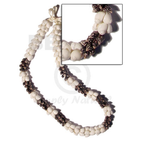 black and white tones of 10mm wood beads in 6 rows glass beads / 20in / ext. chain..